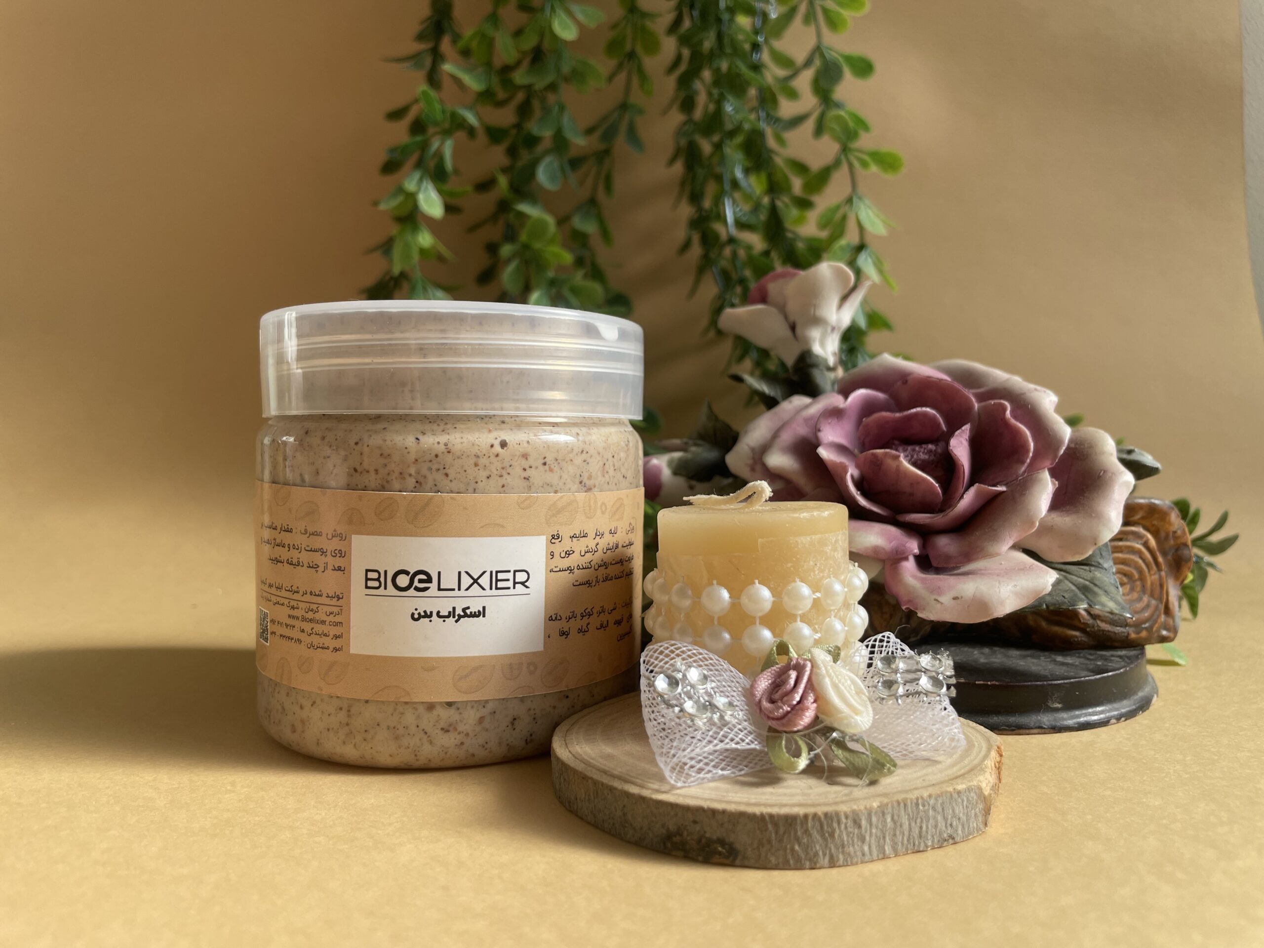• اسکراب بدن بیوالکسیر حاوی گلیسیرین جهت آبرسانی، حفظ رطوبت پوست.
